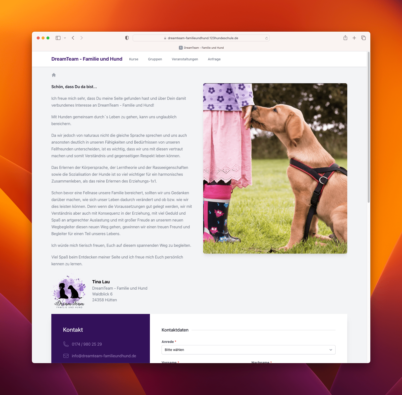 Mit deinem 123Hundeschule-Account erhältst du automatisch eine eigene Webseite unter https://DEIN-NAME.123hundeschule.de. Diese Seite wird mit deinen Kontaktdaten, Kursen, Gruppen, Veranstaltungen und Leistungen befüllt. Du kannst die Startseite individuell gestalten und Links zu deiner eigenen Website oder zu Instagram hinzufügen.